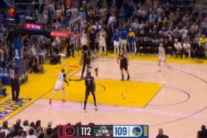 3、在比赛剩余46秒时,追梦在禁区内超过三秒,应该吹罚防守三秒违例,勇士获利。