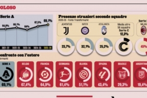 在意甲球队二队之中,米兰二队的外籍球员占比45%,国米二队32.1%、尤文二队23.7%。