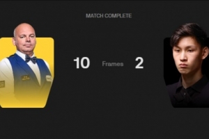 本场比赛,宾汉姆一上来送出9连鞭,以9-0领先王信伯,随后王信伯连追2局,最终2-10不敌宾汉姆。