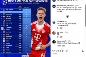 根据德转的数据统计,这是拜仁历史上第14次挺进欧冠四强,排在第二位,仅次于17次进入四强的皇马。