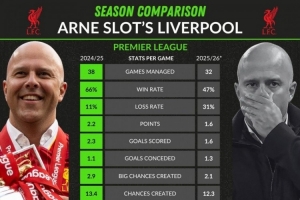 斯洛特两赛季英超表现:胜率-19%、负率+20%,场均进球2.3→1.6