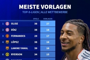本赛季五大联赛球员助攻榜:奥利塞27助断层居首,迪亚斯18助次席