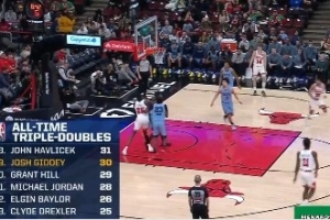 公牛球员吉迪已经拿到13分10篮板10助攻的三双数据,这是他生涯第30个三双,他超越格兰特·希尔,独占三双历史总榜第十九位。